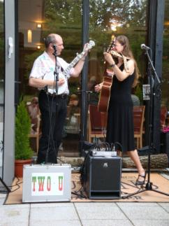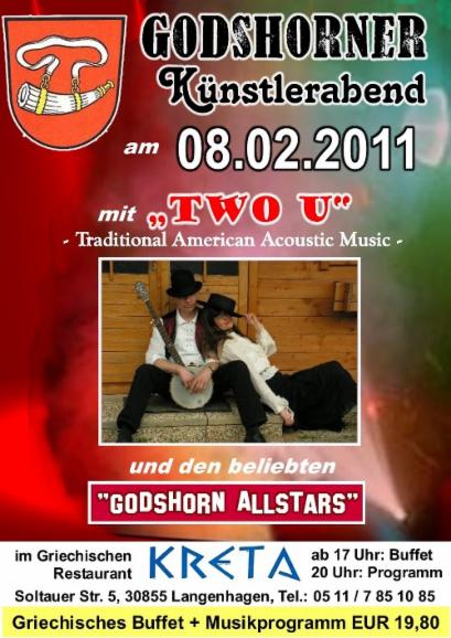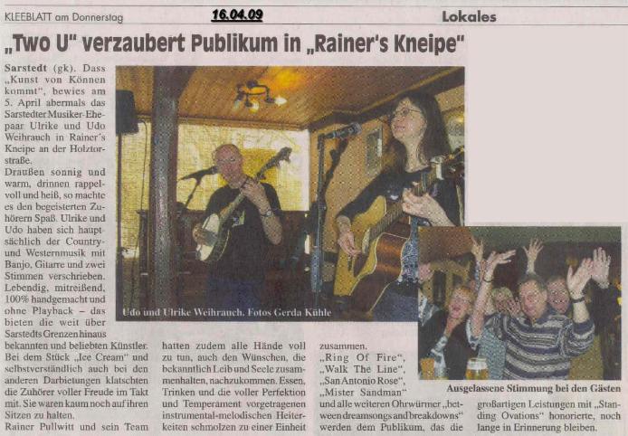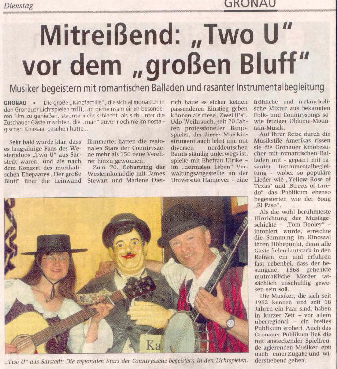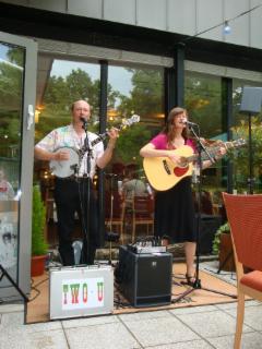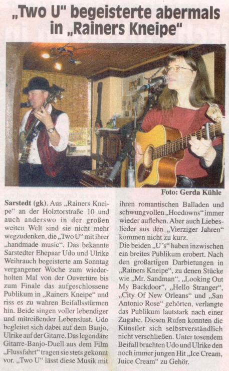 News time to say goodbye... to the road, the stage, two u wir haben beschlossen, uns nach 12 Jahren "Two U" künftig voll und ganz dem Unterricht und unserer "Hausmusik" zu widmen. Wir bedanken uns bei allen, die uns über die Jahre hin begleitet und unterstützt haben, ob als Zuhörer oder Veranstalter, Freunde und Fans, Familie vor und hinter den Kulissen!! Es war eine schöne Zeit mit Euch! Danke! Thank you all! ------------------------------------------------------------------ Lang hat's gedauert, aber nun ist es soweit! Wir sind ab sofort auch mit einem eigenen Kanal bei youtube vertreten und werden ihn nach und nach mit Leben - sprich Videos - füllen. Hier der link zu unserem ersten Video Eine kleine Fotoauswahl zurückliegender Veranstaltungen (in Arbeit): ----------------------------------------------------------------------------------------------------------------------------------------------------- Banjospieler aufgepasst! Weltneuheit! Wir stellen hier das neue Designer-Capo vor ;-) Kurz vor Beginn der wieder einmal sehr schönen Veranstaltung "Banjo & Barbecue" von Ilona Kiegeland im Queens Hotel Hannover, mussten wir leider feststellen, dass das Banjo-Capo nicht seinen Weg in den Koffer gefunden hatte - aber Not macht ja bekanntlich erfinderisch! Und so abenteuerlich es auch aussieht: Es hat funktioniert!! ![]() ---------------------------------------------------------- Inzwischen ist das neue Jahr ja schon nicht mehr ganz so neu und der Terminkalender füllt sich allmählich. Der erste Gig in diesem Jahr war gut besucht und hat uns und allen Anwesenden viel Spaß gemacht! Auch auf die nächsten Termine freuen wir uns schon: Zwei Auftritte gemeinsam mit anderen Musikern, einmal in Sarstedt, dann in Godshorn. Zunächst gibt es sozusagen ein Heimspiel: Am Sonntag, 6. Februar, spielen wir gemeinsam mit den Bourbon Boys von 11.00 - 14.00 Uhr in Rainers Kneipe. Die Bourbon Boys dürften Euch allen bekannt sein. Wie der Name schon vermuten lässt, handelt es sich hier um zwei Mitglieder der allseits beliebten Bourbon Skiffle Company, nämlich Wolfgang Düe und Dirk Fehlauer. Wir sind schon sehr gespannt. Wird bestimmt lustig! ![]() Nur zwei Tage später, am Dienstag, den 8. Februar, sind wir zum "Künstlerabend" in Godshorn eingeladen. Diese im Restaurant Kreta stattfindende Veranstaltungsreihe hat inzwischen schon Kultcharakter und wir freuen uns, dabeisein zu dürfen! Gerade hat uns per mail dieses Plakat erreicht (Danke, Penny,) zusammen mit der Nachricht, dass nur noch wenige Karten für diesen Abend erhältlich sind. Also schnell noch Plätze sichern! ![]() ---------------------------------------------------------- Stadtfest in Sarstedt am 5. September, wo wir kurzfristig für die Kollegen von "Harmonic Transfer" eingesprungen sind: (Dank Euch für die Blümchen!!!)![]() -------------------------------------------------------- Beim 6. "Banjo & Barbecue" im Queens (Danke, Karl u. Heidi, für die Fotos und Eure treue Teilnahme an dieser schönen Veranstaltung ;-) - sowie an dieser Stelle auch ein herzliches Dankeschön an die Veranstalterin, Frau Ilona Kiegeland ("Forum für Kultur und Wissenschaft e.V.) und das Queens Hotel Hannover.) --------------------------------------------------------------------------------- Frühschoppen im Tannenhof/Uchtdorf (eine Wiederholung gibt's am 17. Oktober!) ![]() ------------------------------------------------------ "Two U" spielt für die Eisbären! Am 19. Mai stand für uns eine aufregende Tour auf dem Programm: Wir hatten ein Engangement in der Yukon-Bay! Nein, nicht in Kanada (wenn's auch so aussah), sondern beim Pre-Opening der "Yukon-Bay" im Zoo Hannover: ![]() Vor der stilechten Kulisse einer am Meer gelegenen kanadischen Goldgräberstadt kam echtes Western-Feeling auf, und die Zeit des großen Goldrauschs am Yukon wurde wieder lebendig. Die Menschen genossen das bunte Treiben vor der Market-Hall und am Hafen. Die drei Eisbären, die gerade erst in ihrer neuen Heimat angekommen waren, nahmen's ganz cool und gelassen. ![]() Bärenbrüder: Nanuq und Arktos Ein anderes "tierisches" Erlebnis gab's einige Tage später in Bethel. ![]() Die neugierigen Alpakas haben alle begeistert und wir hätten die kleine Herde am liebsten mit nach Haus genommen. ![]() ------------------------------------------------------ Beim Fischerkreidag in Steinhude ![]() Torfkahn und Jägerkahn - die Preise für die Sieger der Torfkahnregatta ![]() ------------------------------------------------------ Ist ja schon etwas her, aber nun endlich doch auf dieser Seite: Bilder vom Ostermarkt beim Jagdschloss Springe. Wieder einmal ein dickes Dankeschön für die Fotos an Heidi Traeger! ![]() ![]() ![]() Einige unserer Mitstreiter beim Ostermarkt: Roland, Gaston und Scotty, sowie viele schmucke Stände ![]() ![]() ------------------------------------------------------ Auch 2010 geht das "Bluegrass Jamboree!" auf große Deutschland-Tour und wir freuen uns, in Hildesheim wieder mit dabeisein zu dürfen! ![]() Bilder von der abschließenden "Festival Jam Session" des "Bluegrass Jamboree!" in Hildesheim mit Beverly Smith & Carl Jones, den Toy hearts und den Steep Canyon Rangers. ![]() ![]() ![]() ------------------------------------------------------ Vom Nikolaus-Frühschoppen gibt es inzwischen übrigens auch zwei Videos bei youtube: klick hier und hier --------------------------------------------------------- Es sieht fast so aus, als würde es Tradition werden: Der Früschoppen am 2. Advent in "Rainers Kneipe". Viele Freunde waren zum Nikolaus-Früschoppen gekommen und ließen sich in Rainers gemütlichem und adventlich geschmückten "Rockhaus" ihr Bier und das gute Essen von Ramona schmecken. Wer diesmal nicht dabei war, kann sich schon den 2. Advent 2010 vormerken! Bis dahin ist es noch lange hin - ein Besuch in Rainers Rockhouse ist aber jederzeit allen Musikliebhabern wärmstens zu empfehlen. Mindestens einmal im Monat gibt's einen Frühschoppen und auch Donnerstag